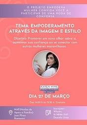 Roda de Conversa- Empoderamento através da imagem e estilo. Objetvo: promover um novo olhar sobre si, aumentar sua confiança ao se conectar com outras mulheres maravilhosas. Realizada no NAF- Núcleo de Apoio à Família. Participação do Rotary e Casa da Amizade.